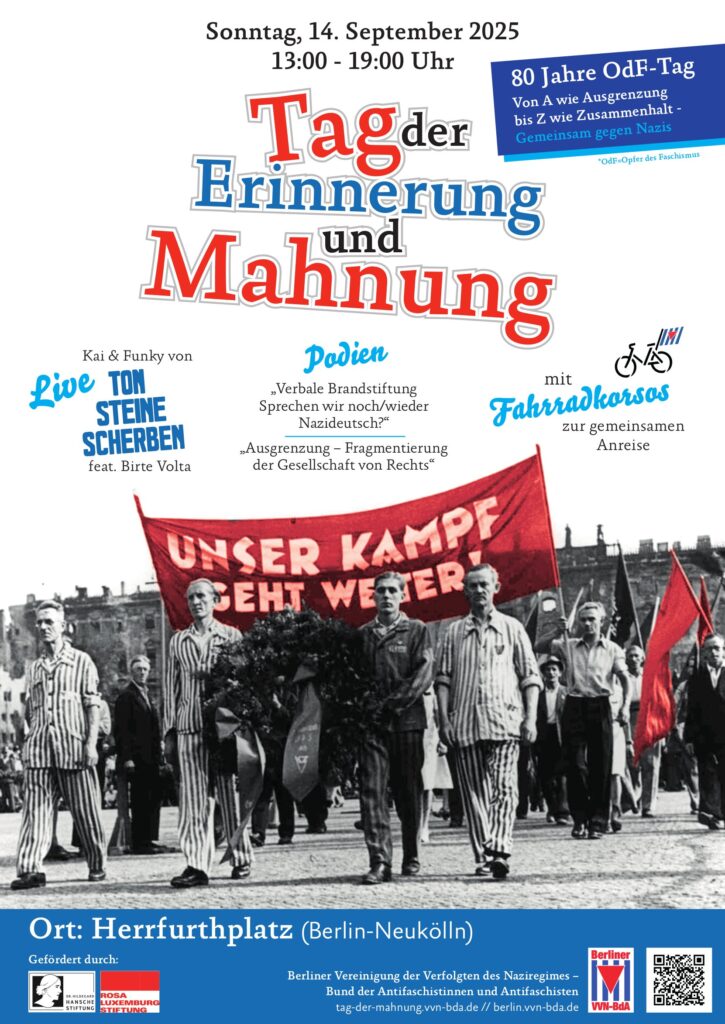 Am 2. Sonntag im September fand in Berlin wie in jedem Jahr der Tag der Erinnerung und Mahnung statt, in diesem Jahr zum 80. Mal. Das Bildungswerk Stanislaw Hantz war mit einem Infostand beteiligt. Der von der Berliner VVN (Vereinigung der Verfolgten des Naziregimes – Bund der Antifaschist*innen https://berlin.vvn-bda.de/) organisierte Gedenktag wurde 1945 von Überlebenden der Konzentrationslager und Zuchthäuser erstmalig ausgerufen und begangen: Hundertausende Antifaschist*innen beteiligten sich damals an einem Sternmarsch, an der Spitze der Züge liefen Überlebende der Konzentrationslager in ihrer Häftlingkleidung zum Werner-Seelenbinder-Sportpark, der damals nach dem 1944 von den Nationalsozialisten ermordeten kommunistischen Widerstandskämpfer und Arbeitersportler umbenannt worden war.